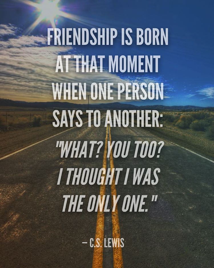 Friendship Is Born. “Friendship is born at that moment when one person says to another: ‘What! You too? I thought I was the only one.'” — C.S. Lewis Share this! Click to share on Facebook (Opens in new window) Facebook Click to share on X (Opens in new window) X Click to share on Tumblr (Opens in new window) Tumblr Click to share on Reddit (Opens in new window) Reddit Click to print (Opens in new window) Print Click to email a link to a friend (Opens in new window) Email More Click to share on Pinterest (Opens in new window) Pinterest Like Loading...