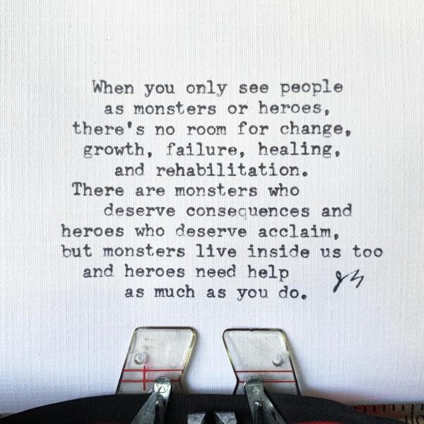 Yes, monsters deserve justice for their crimes. Heroes deserve more applause. But I will pause to consider that we are often both. We can be our own worst enemy, and we are just as capable of being our own heroes, overcoming the worst of us with the best in us.